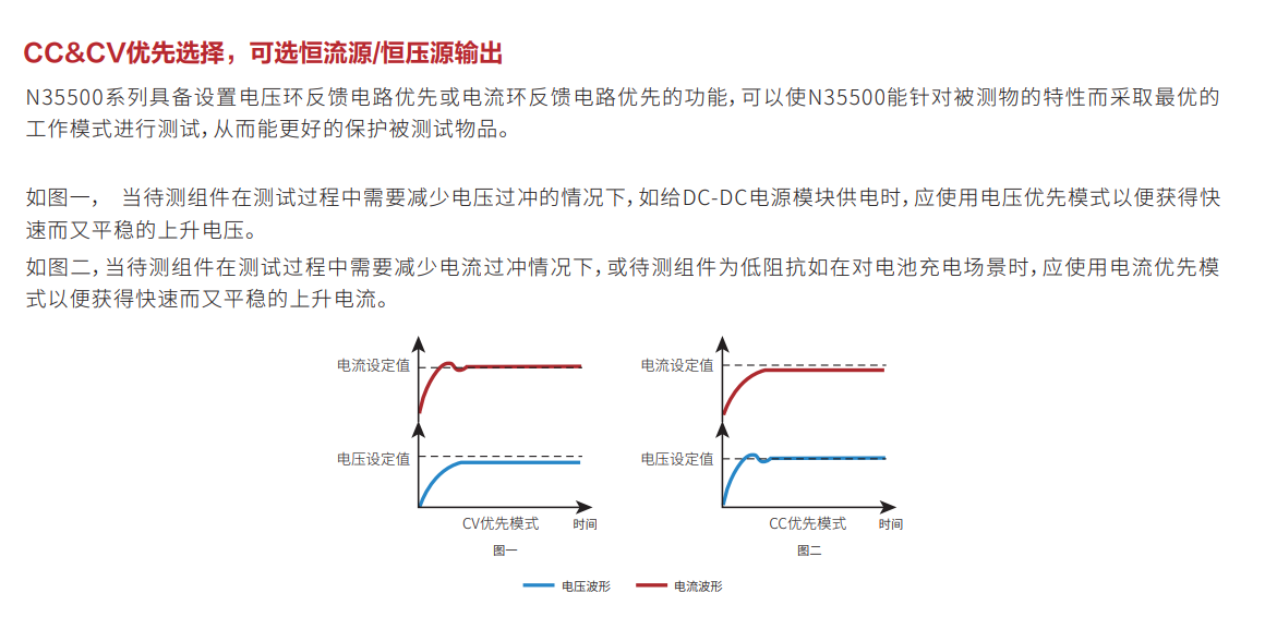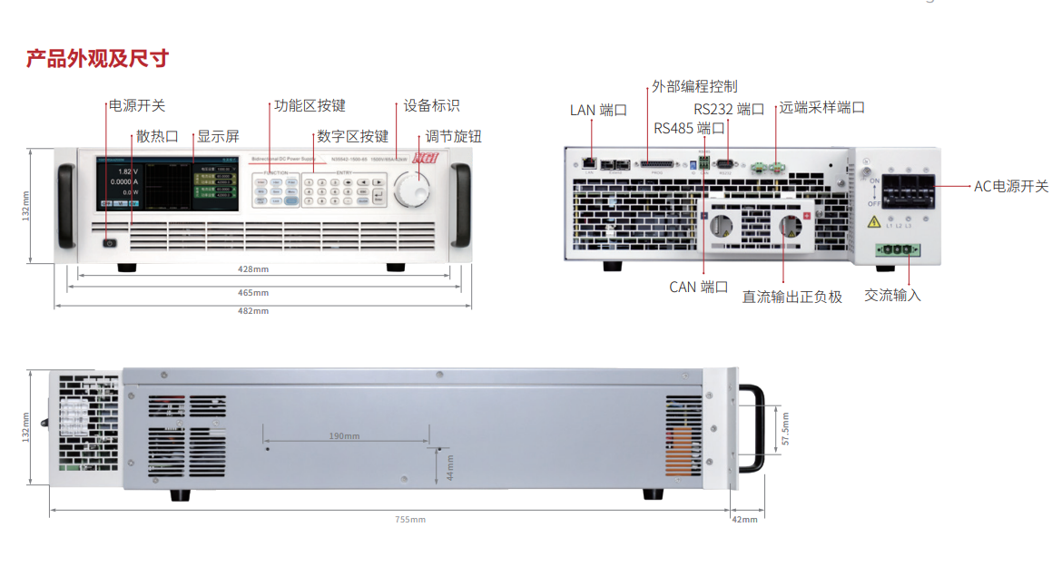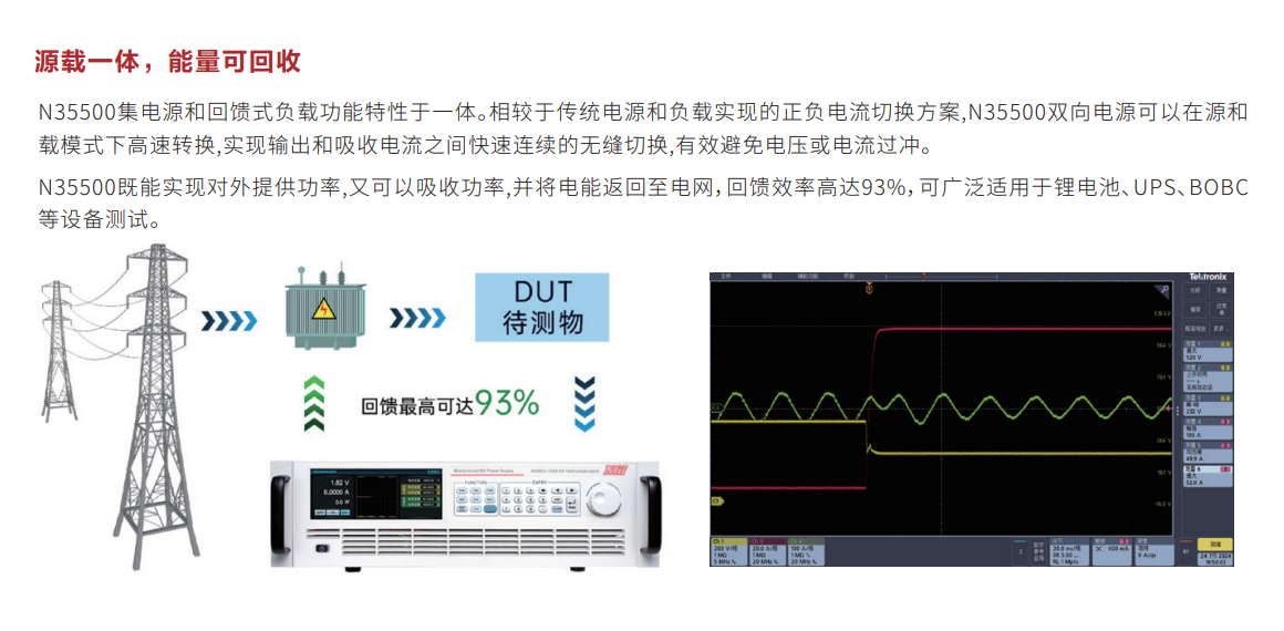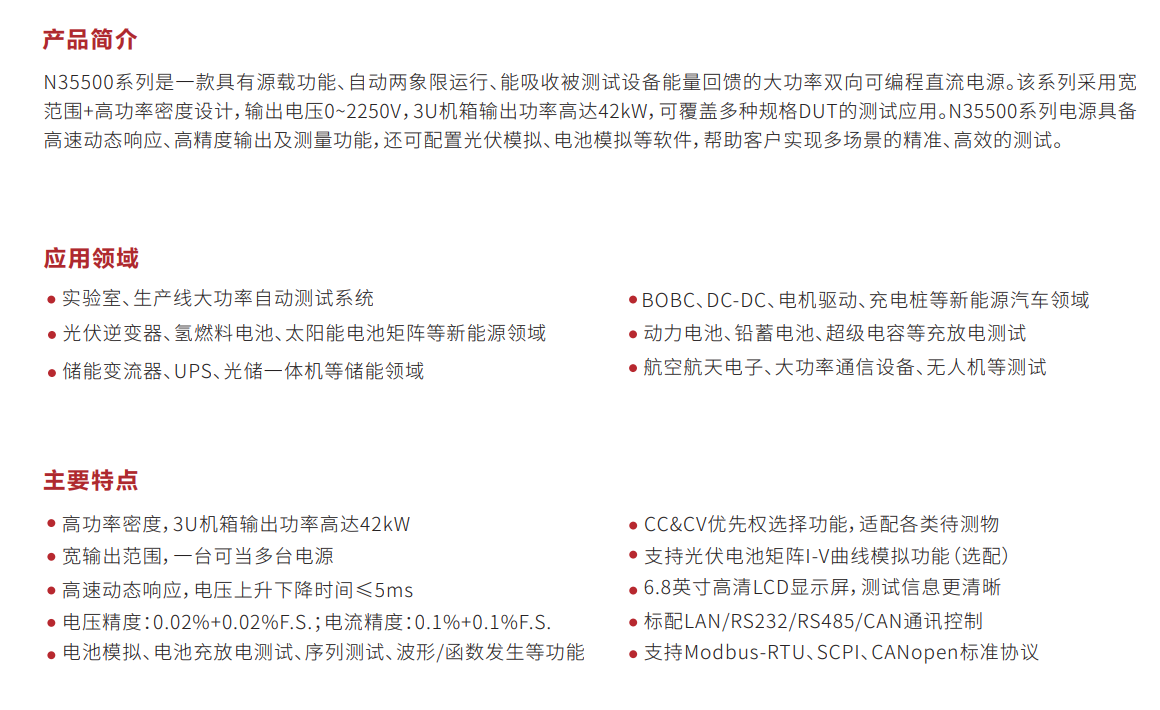 概述: N35500系列是一款具有源载功能、自动两象限运行、能吸收被测试设备能量回馈的大功率双向可编程直流电源。该系列采用宽范围+高功率密度设计,输出电压0~2250V,3U机箱输出功率高达42kW,可覆盖多种规格DUT的测试应用。N35500系列电源具备高速动态响应、高精度输出及测量功能,还可配置光伏模拟、电池模拟等软件,帮助客户实现多场景的精准、高效的测试。