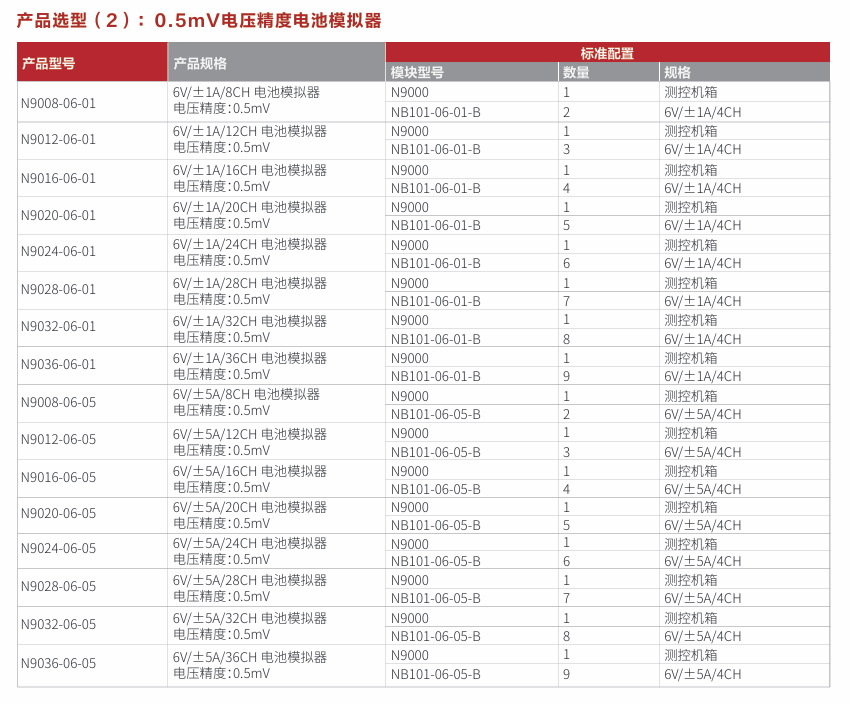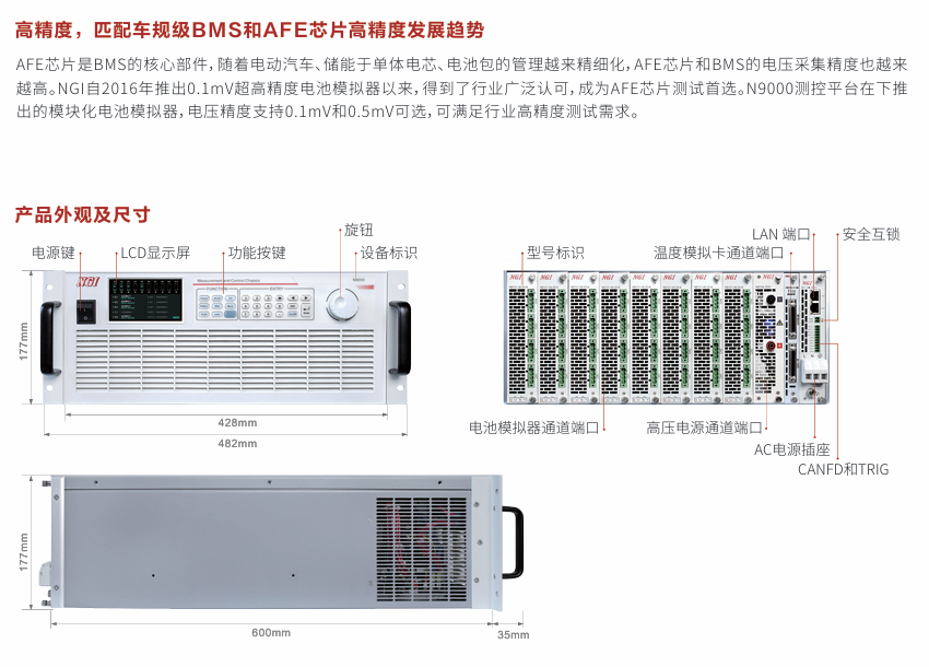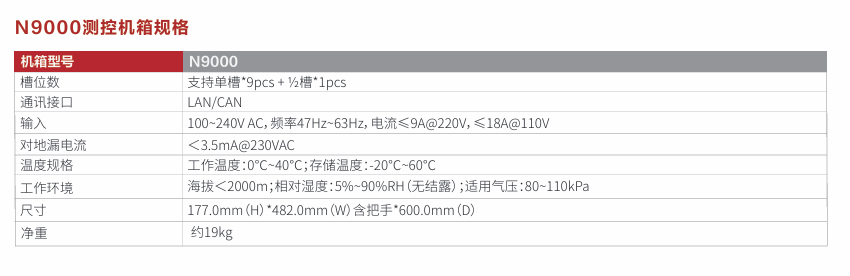 N9000系列是一款高实时、高同步、大功率的测控平台,由N9000测控机箱和各种测控模块组成。N9000是标准19英寸4U标准机箱,可集成10卡槽测控模块,支持插入电池模拟器卡、温度模拟卡、高压电源卡等类型,各模块间电气隔离。N9000系列支持本地/远程控制,支持同步触发功能,可实现多模块高速同步控制,可广泛适用于多通道、高集成度、大功率的自动化测试测量场景。