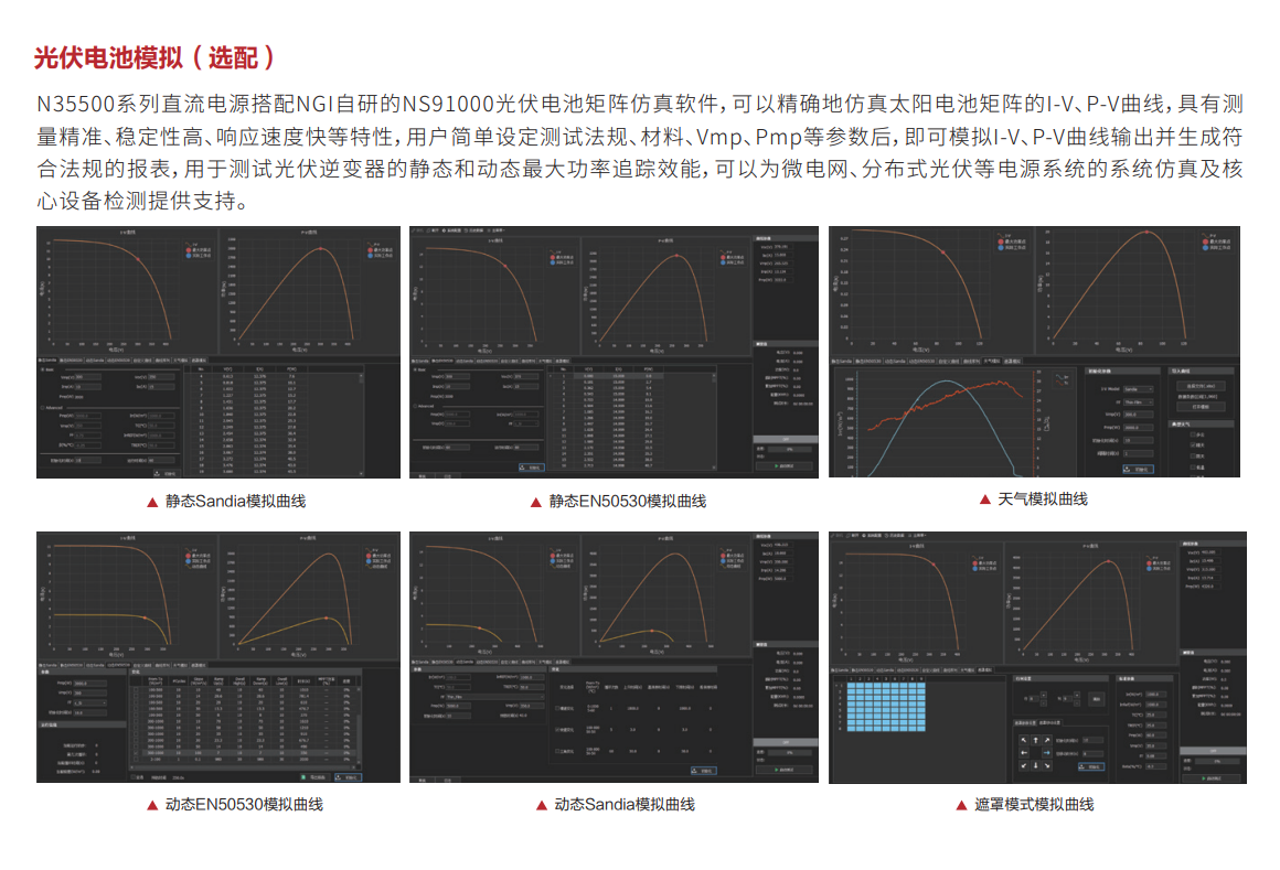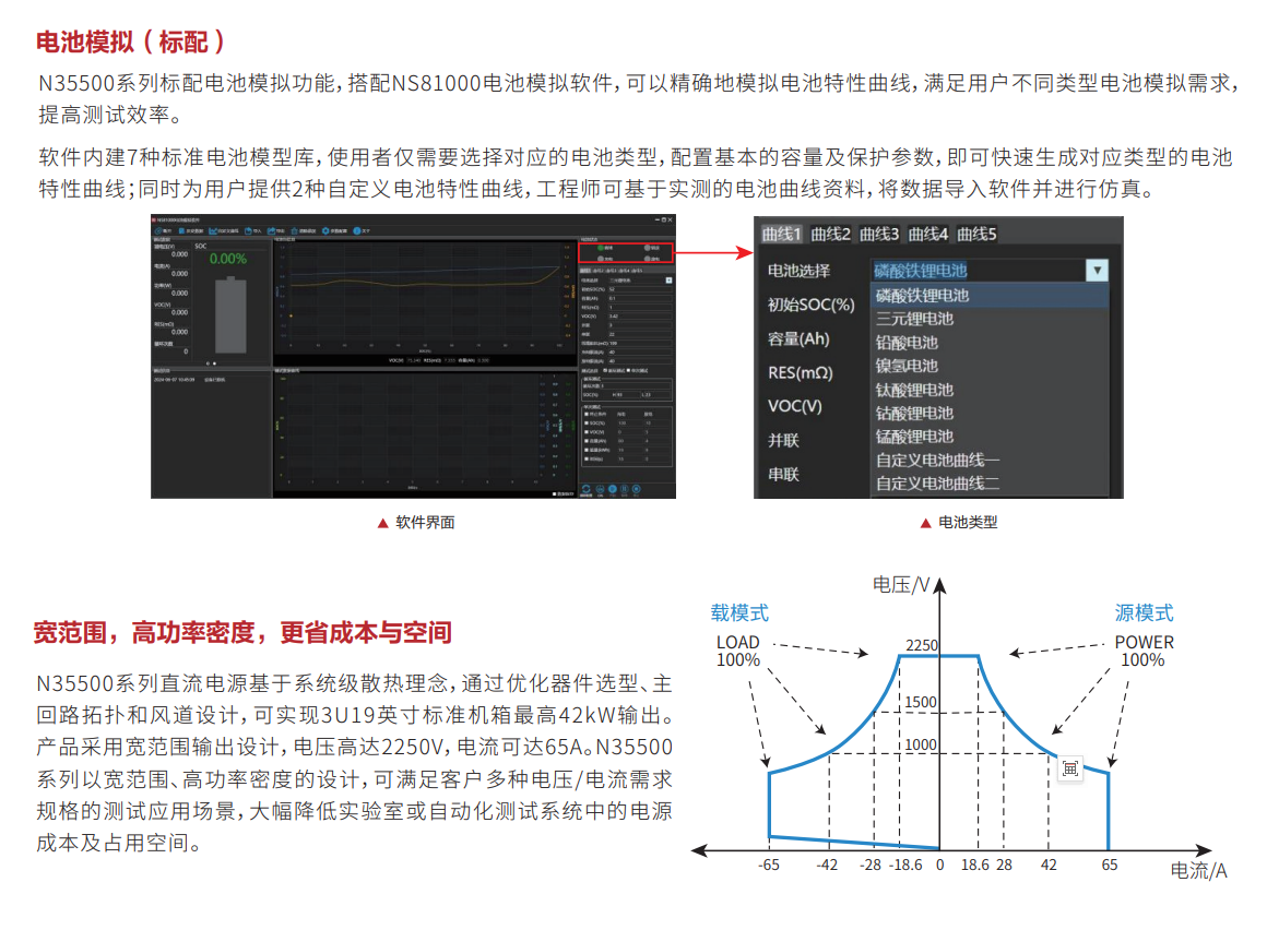 概述: N35500系列是一款具有源载功能、自动两象限运行、能吸收被测试设备能量回馈的大功率双向可编程直流电源。该系列采用宽范围+高功率密度设计,输出电压0~2250V,3U机箱输出功率高达42kW,可覆盖多种规格DUT的测试应用。N35500系列电源具备高速动态响应、高精度输出及测量功能,还可配置光伏模拟、电池模拟等软件,帮助客户实现多场景的精准、高效的测试。