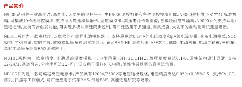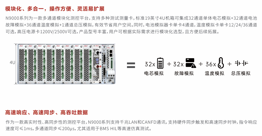 N9000系列是一款高实时、高同步、大功率的测控平台,由N9000测控机箱和各种测控模块组成。N9000是标准19英寸4U标准机箱,可集成10卡槽测控模块,支持插入电池模拟器卡、温度模拟卡、高压电源卡等类型,各模块间电气隔离。N9000系列支持本地/远程控制,支持同步触发功能,可实现多模块高速同步控制,可广泛适用于多通道、高集成度、大功率的自动化测试测量场景。
